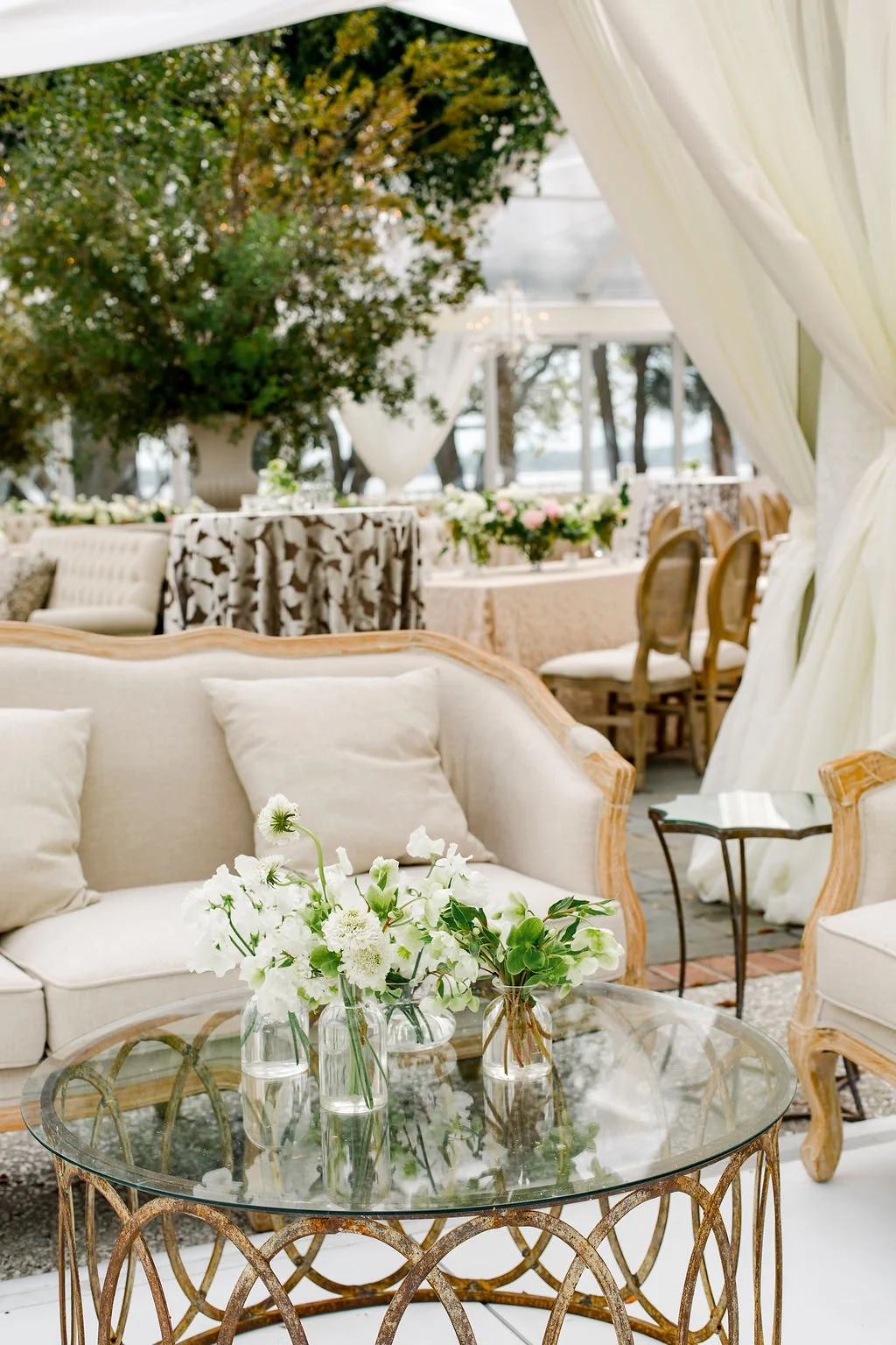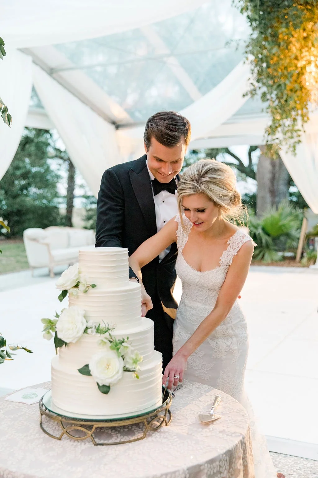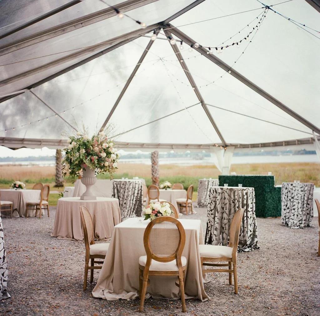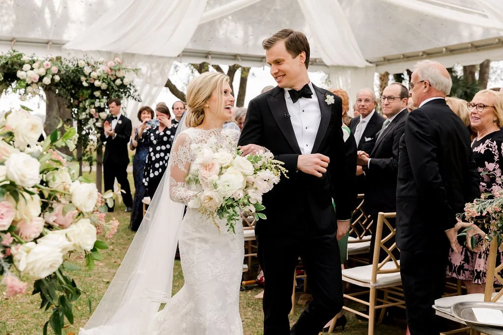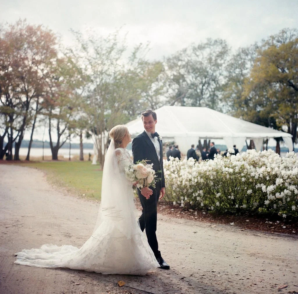 Photo: Gayle Brooker | Video: Withers Films | Floral: Blossom Events | Rentals: EventWorks (dance floor, stage); La Tavola Fine Linen (linens); Nüage Design (linens); Curated Events (lounge); Party Tables (linens); Snyder Events (tents) | Draping: Social Spool | Custom Builds: Blossom Events | Stationery: Dear Eloise | Calligraphy: Elizabeth Porcher Jones | Venue + Catering + Bar: Patrick Properties Hospitality Group | Hair + Makeup: Ash + Co. | Bride’s attire: Monique Lhuillier (gown) | Groom’s attire: Giorgio Armani (tuxedo); Cole Haan (shoes); Hugo Boss (bow tie) | Ceremony Entertainment: Bob Williams | Reception Entertainmen: The Celebrity All Star Band | Transportation: SC Express